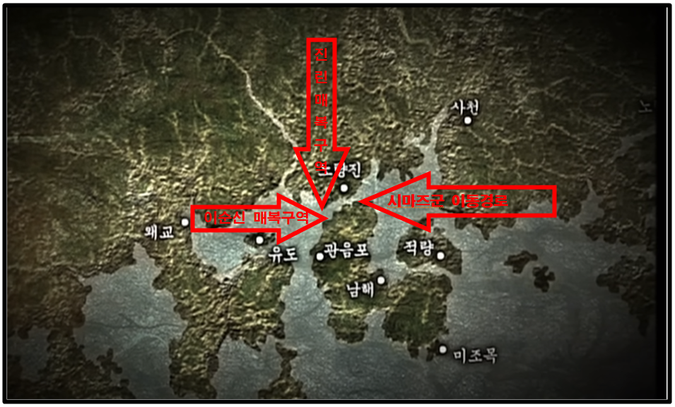 하지만 일본군의 퇴각은 쉽지 않았습니다. 아직 해가 뜨지 않아 퇴각하는 일본군의 눈앞에는 어둠이 깔려 있었기 때문입니다. 일본군의 캄캄한 어둠속에서 바다가 아닌 관음포쪽으로 길을 잘못 들어가고 말았습니다. 서둘러 배를 돌려 나오려고 했지만, 이미 입구엔 조명연합군이 대기하고 있었습니다.