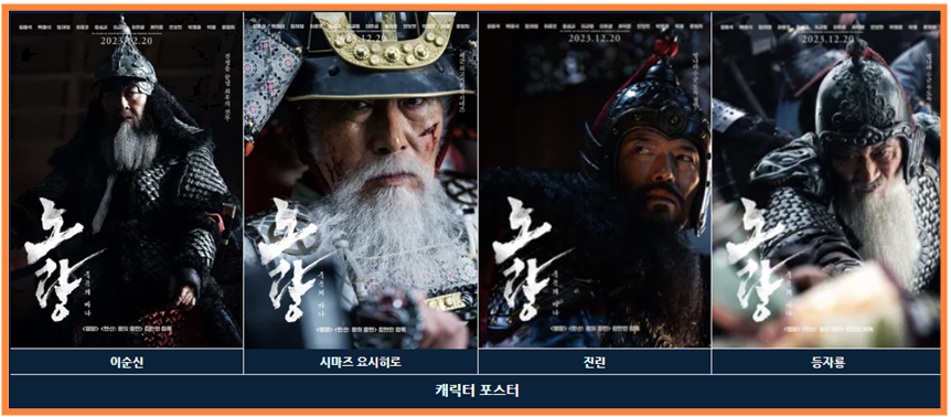 이번 영화의 이순신 역할은 김윤석배우님이 맡으셨고, 시마즈 요시히로역의 백윤식배우님, 명나라 장수의 진린은 정재영 배우님, 고니시유키나가역할은 이무생배우님이 맡으셨습니다. 이순신 영화 시리즈에서는 이순신 배우의 역할을 매번 교체를 했는데요. 김윤석배우님이 연기하시는 이순신 장군님은 어떠할지 기대가 됩니다.